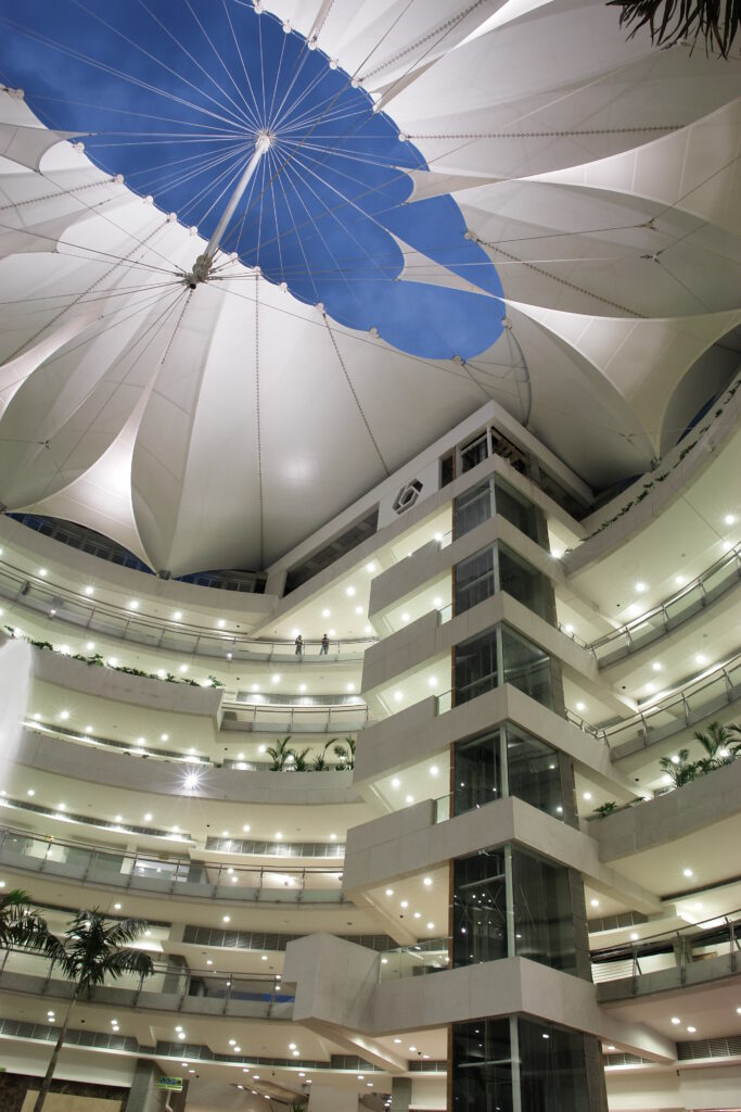 The tower boasts bioclimatic architecture; within its space, the temperature is 1.5 degrees Celsius lower than in the rest of the shopping center.